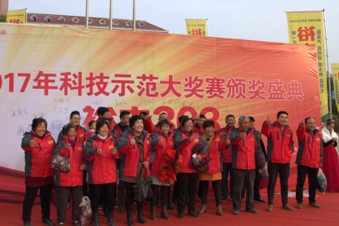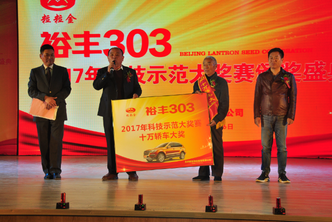 現(xiàn)場(chǎng)針對(duì)2017年221名裕豐303優(yōu)秀種植示范戶分別頒發(fā)十萬轎車、金磚、電動(dòng)三輪車獎(jiǎng)品,以表彰他們科學(xué)種田、示范推廣優(yōu)良品種裕豐303所作出的突出貢獻(xiàn)。其中一等大獎(jiǎng)價(jià)值十萬元的轎車被安徽蕭縣酒店鎮(zhèn)胡孝蘭摘得,其中參賽產(chǎn)量為2252.9斤;二等獎(jiǎng)價(jià)值5000元的金磚分別被河南省西華縣、滑縣、山東省梁山縣、陽信縣、河北省臨漳縣、任丘市、安徽利辛縣、泗縣、江蘇灌云到等20個(gè)縣市示范戶獲得,其中山東省平度市張舍鎮(zhèn)石賢勝畝產(chǎn)達(dá)2108斤、滕州市張汪鎮(zhèn)張佑代畝產(chǎn)達(dá)2025.36斤、河北省灤平縣大屯鄉(xiāng)王國強(qiáng)畝產(chǎn)達(dá)2040.28斤;二等獎(jiǎng)20名平均畝產(chǎn)達(dá)1800以上。