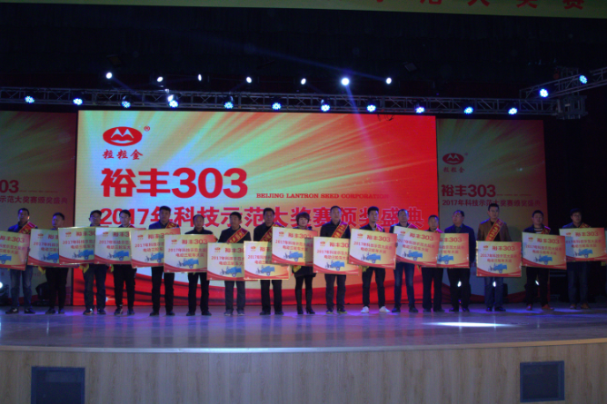 2017年11月16日,由北京聯(lián)創(chuàng)種業(yè)股份有限公司舉辦的2017年裕豐303科技示范大獎(jiǎng)賽頒獎(jiǎng)盛典在安徽蕭縣會(huì)議中心隆重舉行。安徽省蕭縣人民政府副縣長李建明、蕭縣農(nóng)委、農(nóng)技推廣中心、蕭縣人民廣播電臺(tái)、北京聯(lián)創(chuàng)種業(yè)公司總裁彭澤斌、副總裁史澤琪、粒粒金事業(yè)部總經(jīng)理王青才等有關(guān)領(lǐng)導(dǎo)以及來自河南新農(nóng)村頻道、山東農(nóng)科頻道、河北電視臺(tái)、農(nóng)民日?qǐng)?bào)、河北農(nóng)民報(bào)、河南科技報(bào)、江蘇科技報(bào)、安徽種業(yè)、農(nóng)財(cái)寶典等有關(guān)媒體朋友參加了本次頒獎(jiǎng)盛典;來自北京、天津、河南、山東、河北、安徽、江蘇七省市廣大農(nóng)技推廣商及周邊種植農(nóng)戶2000多人也參加了此次頒獎(jiǎng)盛典。北京聯(lián)創(chuàng)種業(yè)總裁彭澤斌現(xiàn)場(chǎng)宣讀了《北京聯(lián)創(chuàng)種業(yè)關(guān)于對(duì)2017年裕豐303科技示范戶表彰的決定》,副總裁史澤琪作《北京聯(lián)創(chuàng)種業(yè)關(guān)于2017年裕豐303科技示范工作實(shí)施的報(bào)告》,內(nèi)容精彩繪呈,引起與會(huì)者陣陣熱烈掌聲。